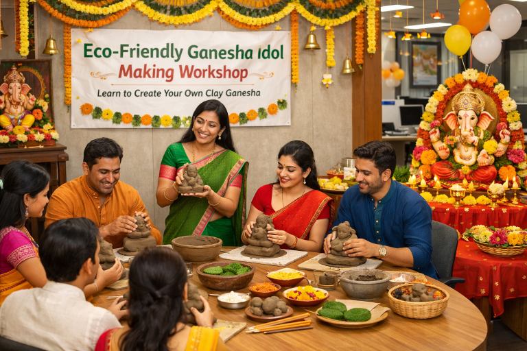 Art of Sculpting: Eco-Friendly Ganesha Making Workshop invites participants to reconnect with creativity, consciousness, and culture — all in one mindful experience. In this hands-on workshop, you’ll sculpt your own eco-friendly Ganesha idol using natural clay, celebrating tradition while supporting sustainability. Guided by expert facilitators, participants explore the joy of artistic expression, learn about eco-conscious festive practices, and craft a symbol of divinity that returns gently to the earth. Perfect for corporate engagements, team-building events, and social gatherings, this workshop transforms creativity into a collective act of environmental responsibility. Experience how art, faith, and sustainability come together — beautifully and meaningfully